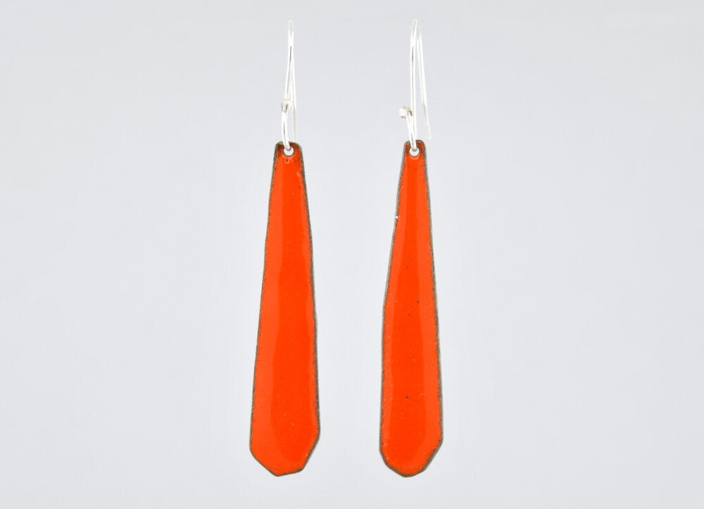 Inspired by the petals of the prolific arrowleaf balsamroot that can be seen brightening hillsides during Montana's spring, these hand-enameled earrings are made from reclaimed steel that has been cut and enameled into colorful petal-shaped forms. Approximately 2 1/4 inch long and 3/8 inch wide, the enameled steel hangs on hand-formed recycled sterling silver earwires.