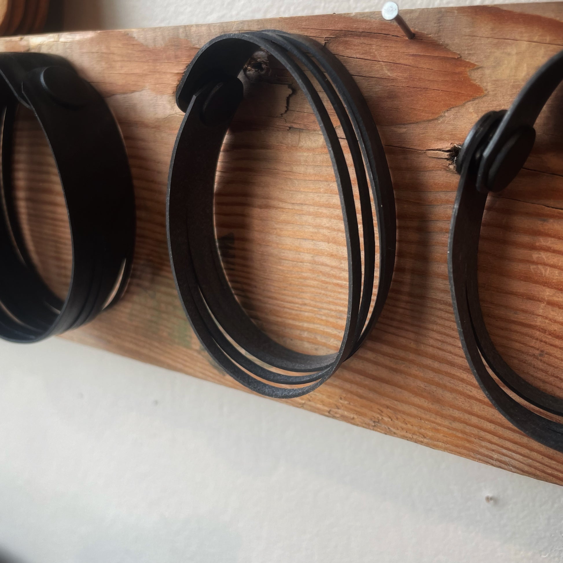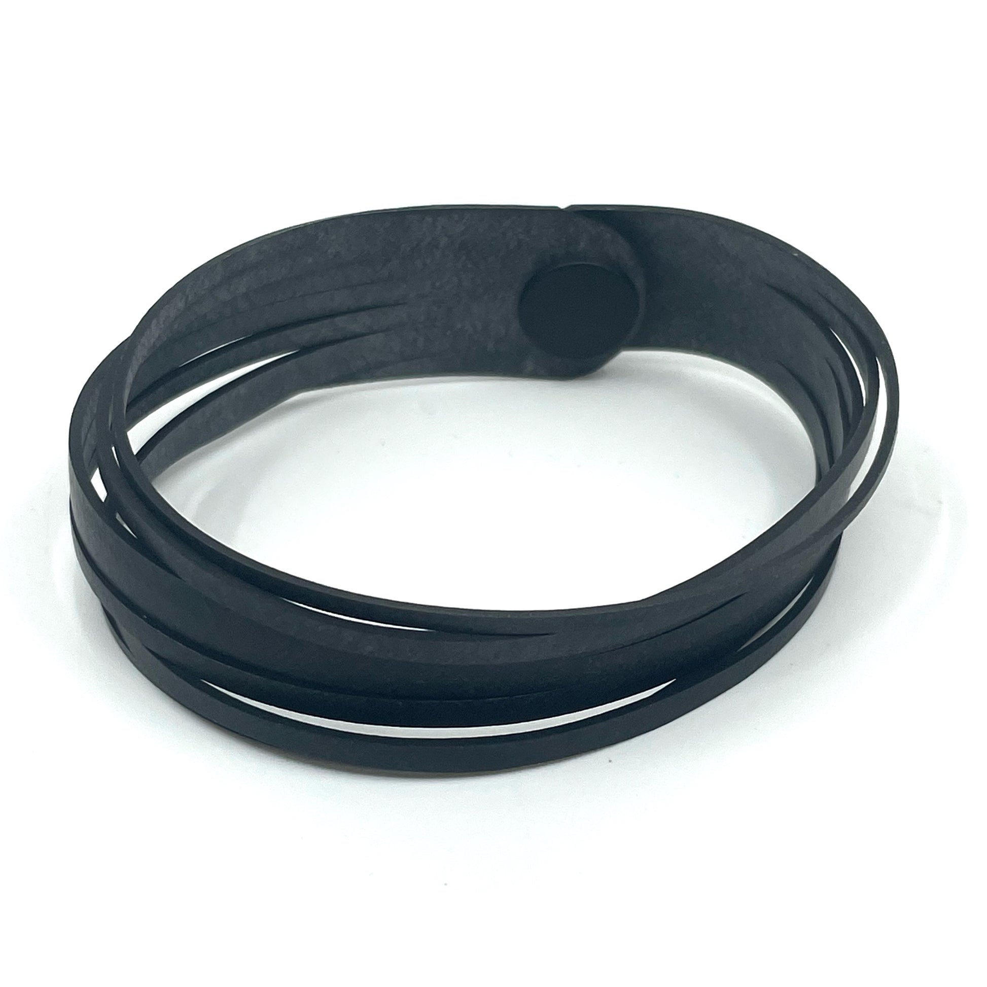 Pedal your style to the next level with our Up Line Snap Bracelet! Crafted from post-punctured bicycle inner tubes, this eco-chic accessory features long cuts creating a cascade of sleek black strands. With a snap closure for easy wear, it's the perfect blend of sustainability and edgy design. Wrap your wrist or rock it as an anklet! It’s a statement piece that's as unique as you. Sustainable fashion never looked so good!