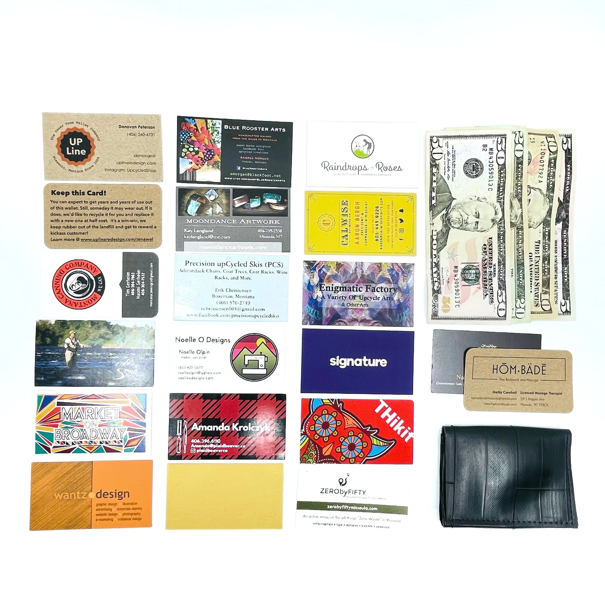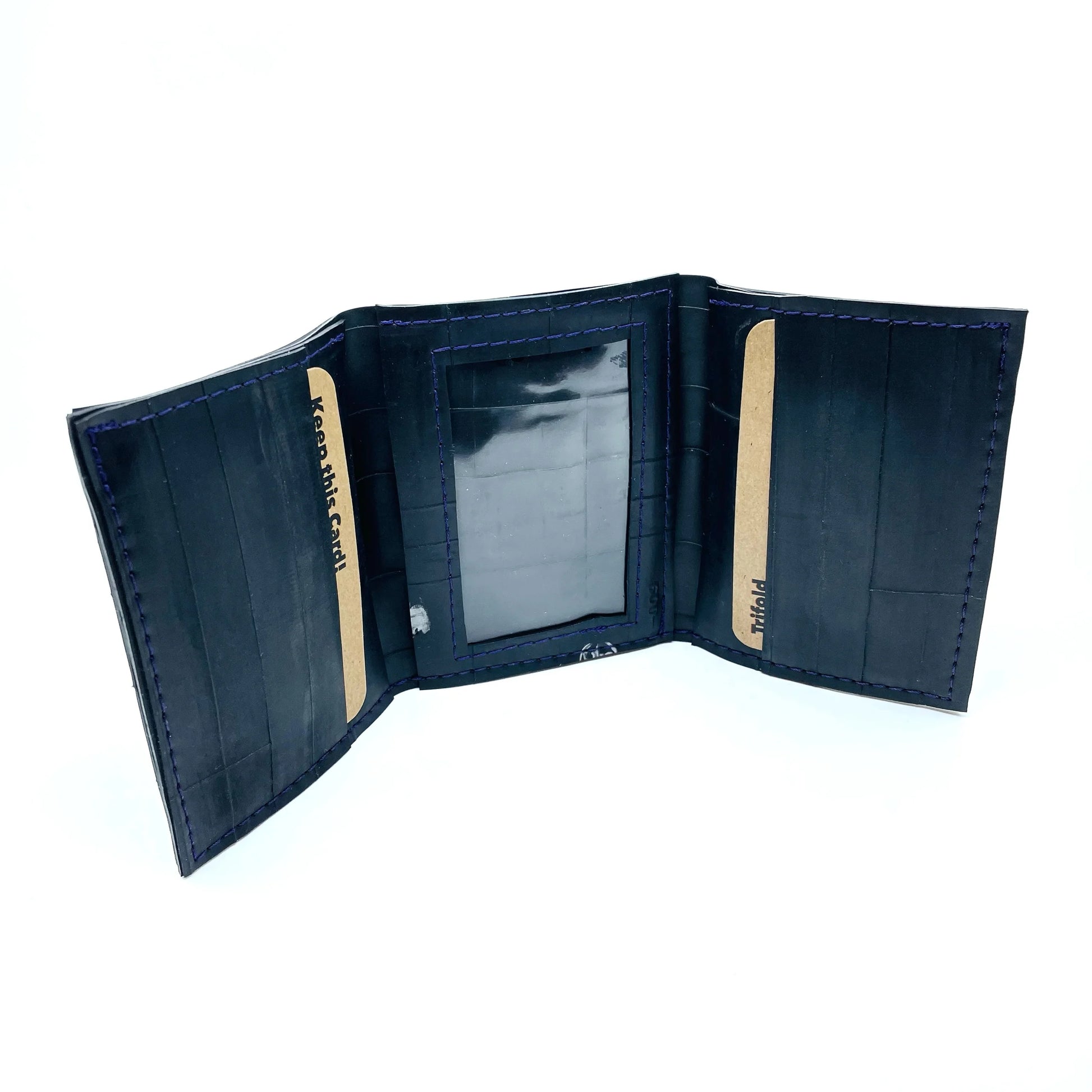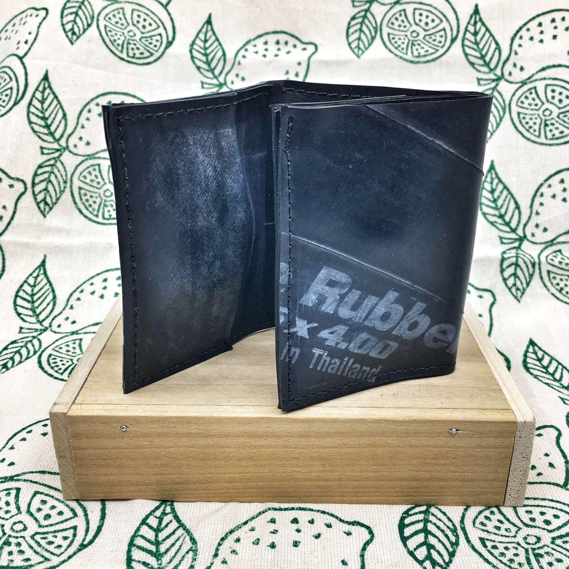 Handcrafted from discarded bike tubes, this is our biggest billfold. Two interior card slots, three oversized under pockets, and an ID window accommodate up to 20 cards. Our bill pocket accommodates oversized international banknotes and receipts. 4" x 9" or 3.25 " x 4" when folded.