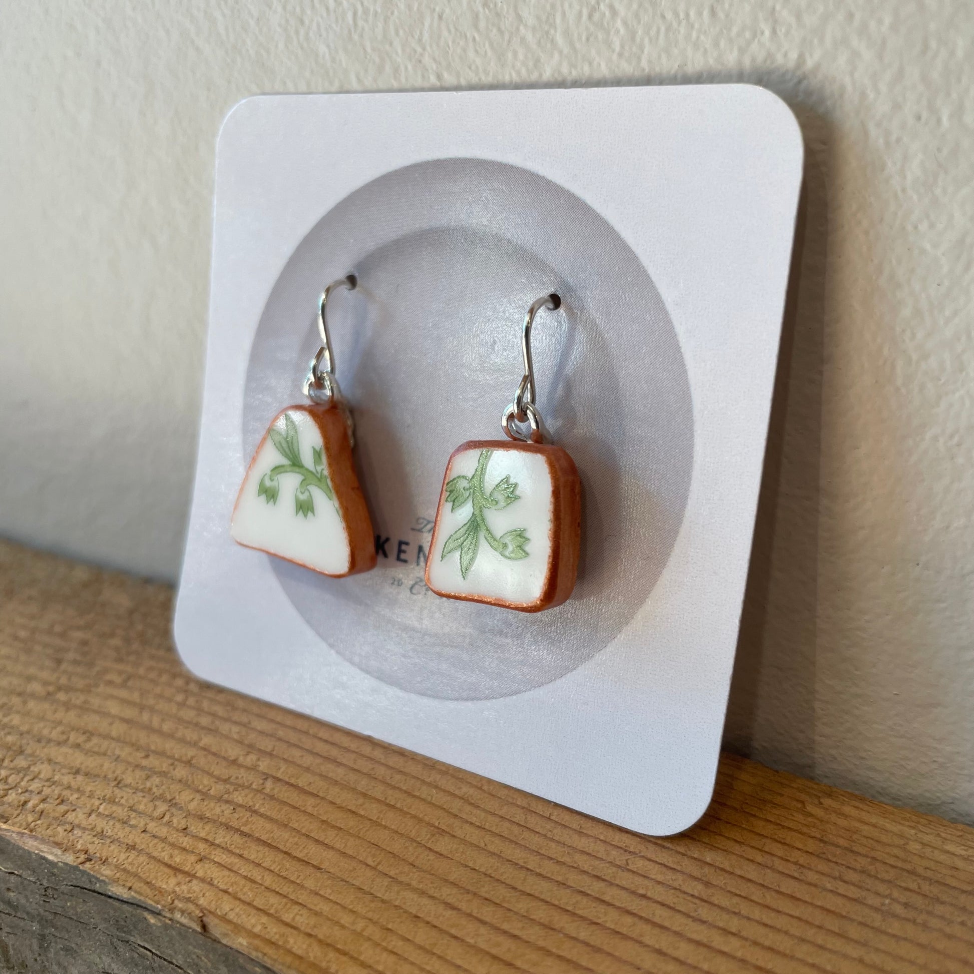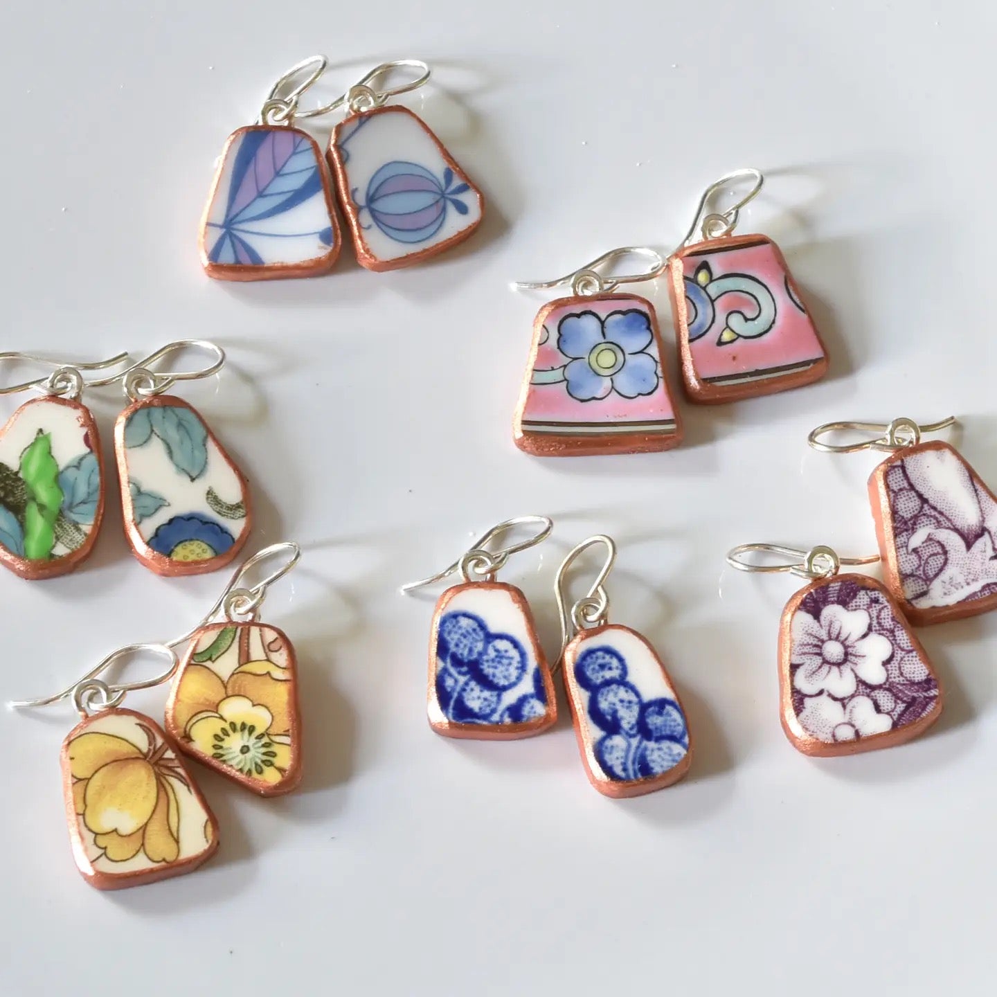 These playful Broken Plate Recycled china shard with copper edging and sterling silver hooks. Each earring brings a touch of eco-friendly charm and a story to your style, turning what was once broken into a dazzling statement. Perfect for adding a bit of whimsy and sustainability to any outfit!
