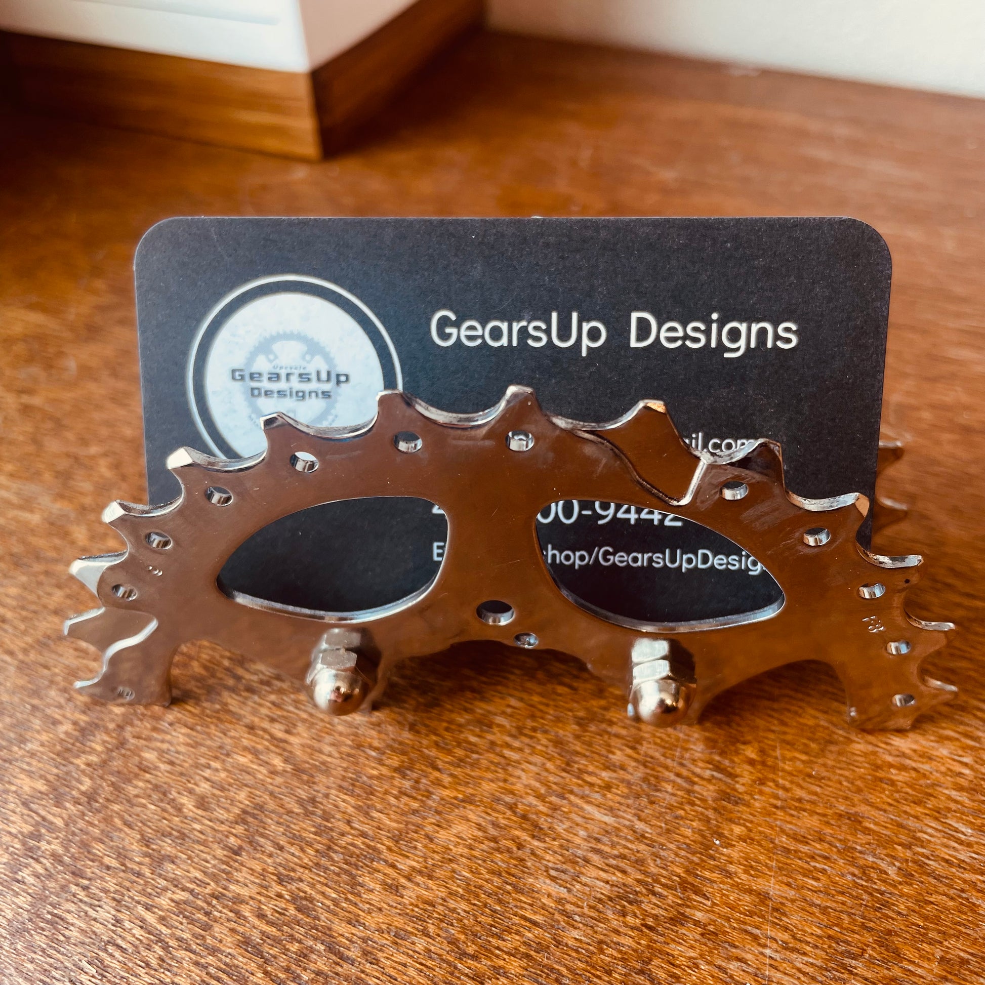 Keep your business cards organized and eco-friendly with our Sprocket Card Holder. Made from repurposed bicycle sprockets, it's both stylish and sustainable. Perfect for networking events and office meetings.