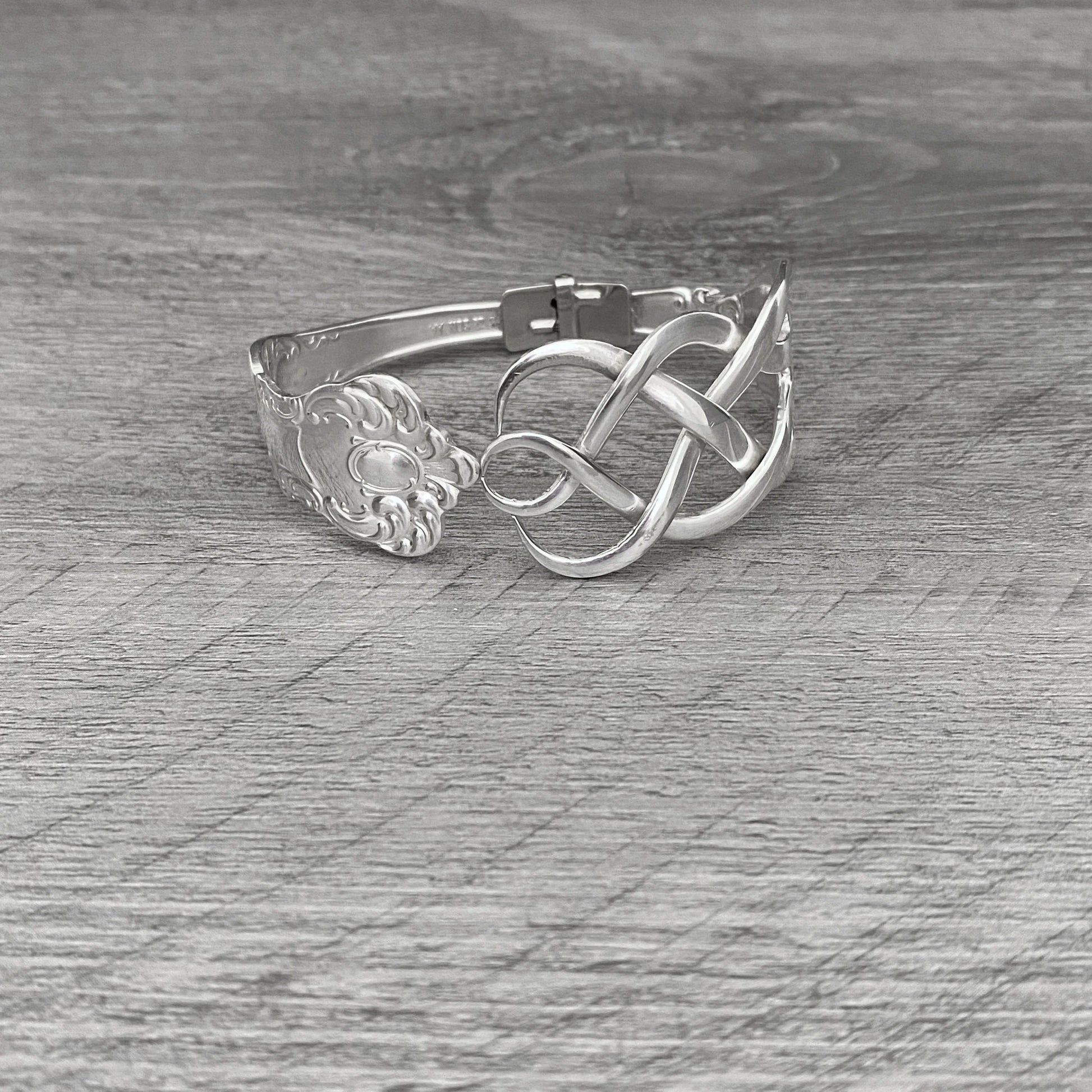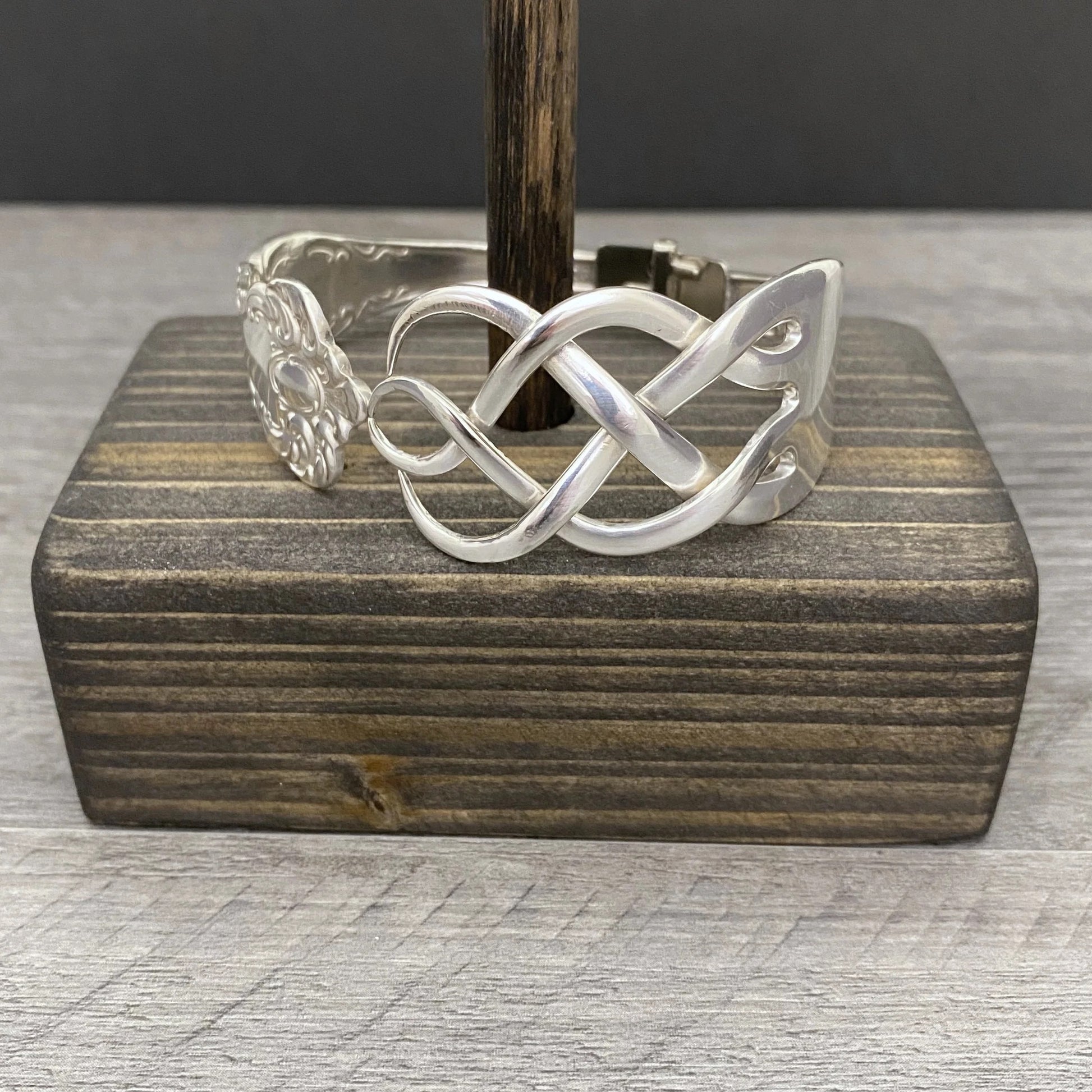Indulge in the luxurious elegance of our handcrafted Celtic weave fork bracelet, meticulously crafted from a vintage silver plated dinner fork. The intertwined tines form an intricate Celtic pattern, with a narrow width of 1" and a small spring hinge for effortless opening and closing. Experience the sophisticated beauty of this unique piece, where art and fashion come together seamlessly.