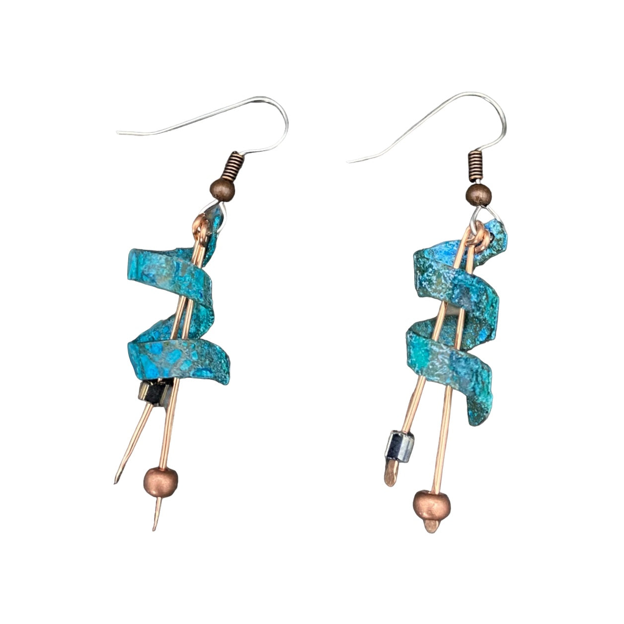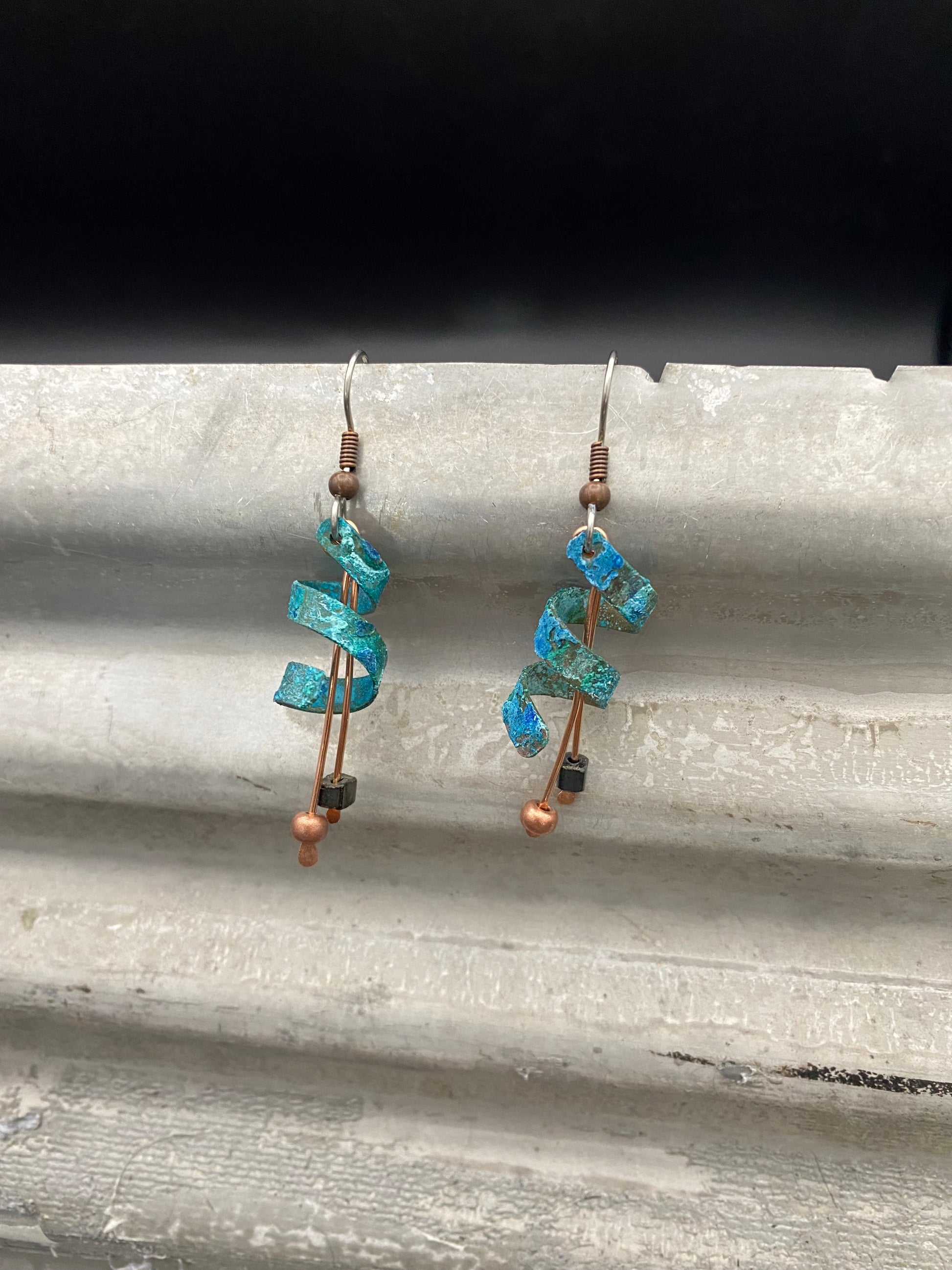 The metal area of the earring is 3.5 cm long. The overall length including the earring hook is 5.5 cm long. This piece is made from recycled copper. Each piece is made by hand so patina color and size will vary.