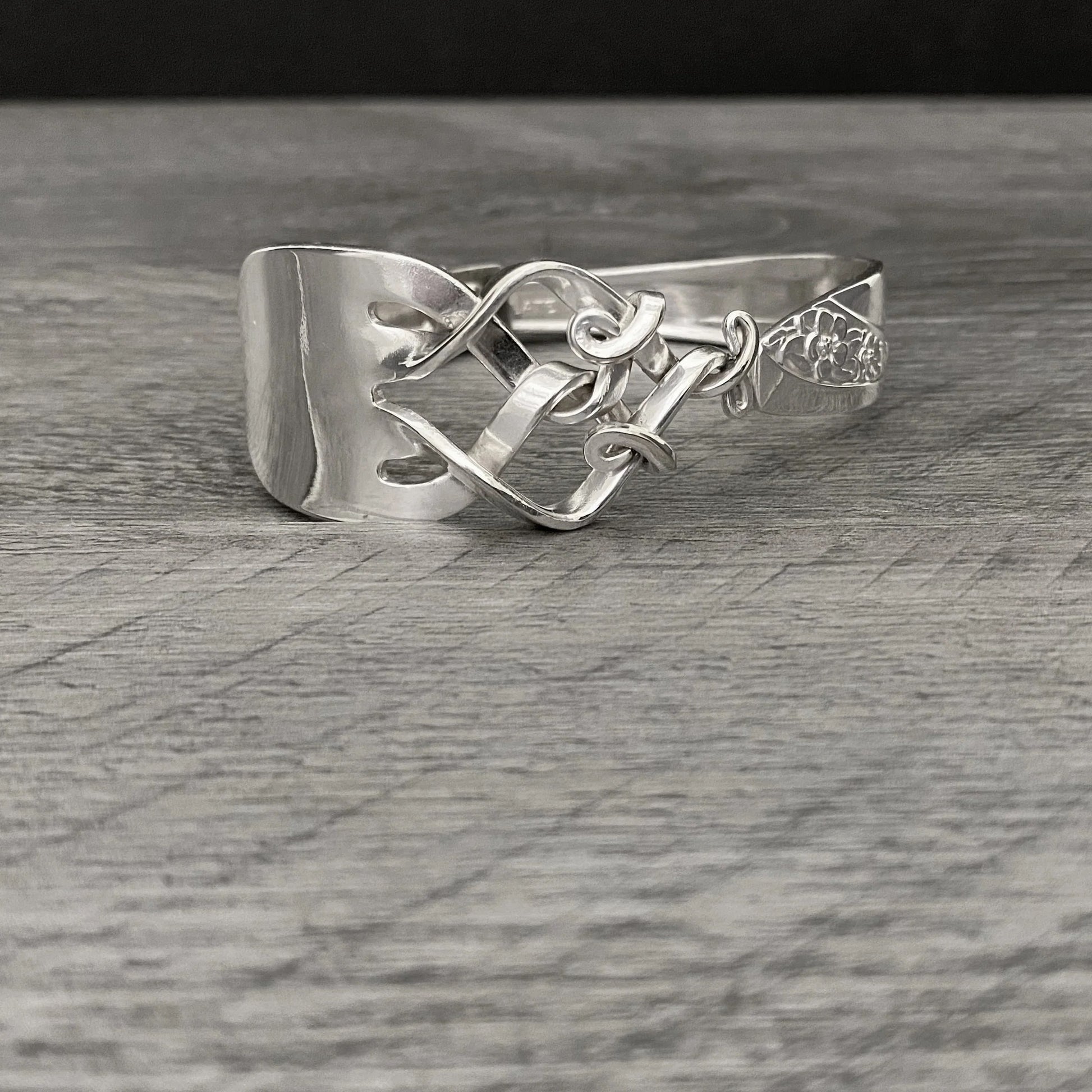 The unique teardrop shape of this premium fork bracelet is created by twisting the two inner tines to the side and then gently flattening them. They come together and twist around each other, while the outer tines form a twist that then folds over and curls inside. A lead-free soldered spring hinge allows for easy wearing. This design measures approximately 1" in width.