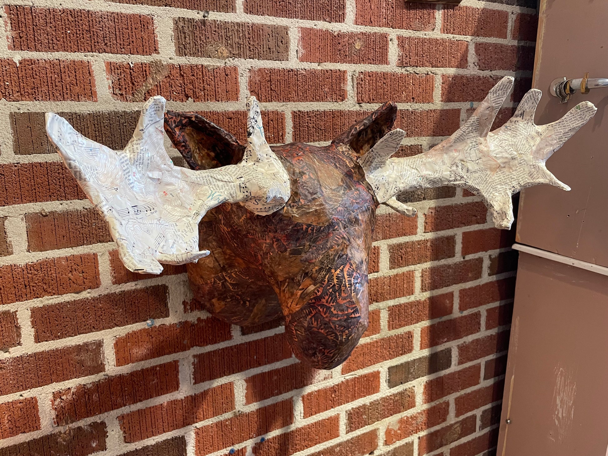 This quirky, paper-mâché masterpiece is sure to make an impression! One happy moose handcrafted from old maps and brown paper bags. Amp up your home decor game with this faux taxidermy today! This piece measures 24" at its widest dimension. Super light and easy to mount.