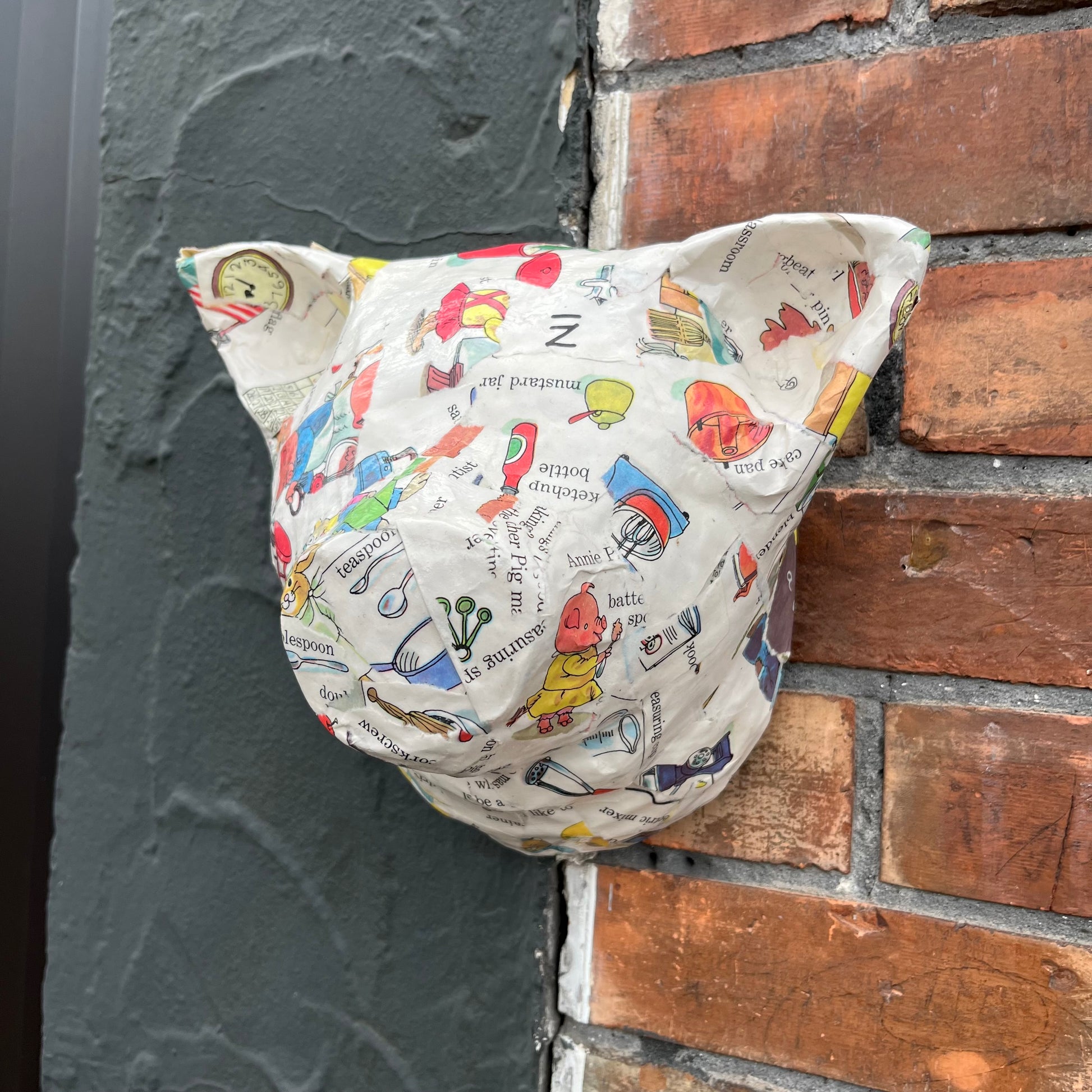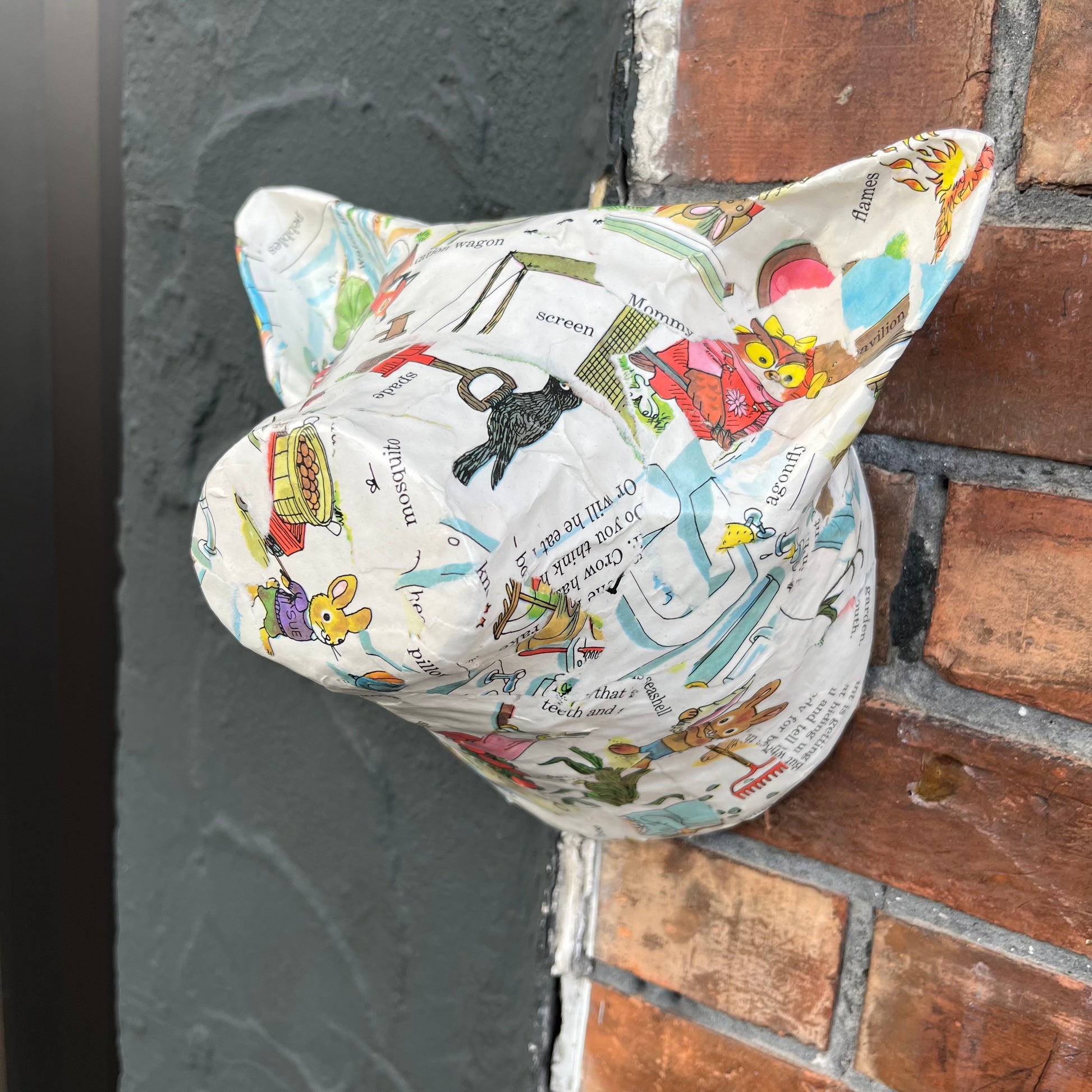 This whimsical papier-mâché pig is handcrafted from the beloved pages of a well-loved Richard Scarry children's book, giving it a charming literary backstory. Perfect for book lovers and quirky décor enthusiasts, this faux taxidermy piece brings nostalgic storybook magic to any room. Each pig is unique, featuring colorful illustrations peeking through the papier-mâché layers. A delightful conversation starter that celebrates upcycling and childhood wonder!