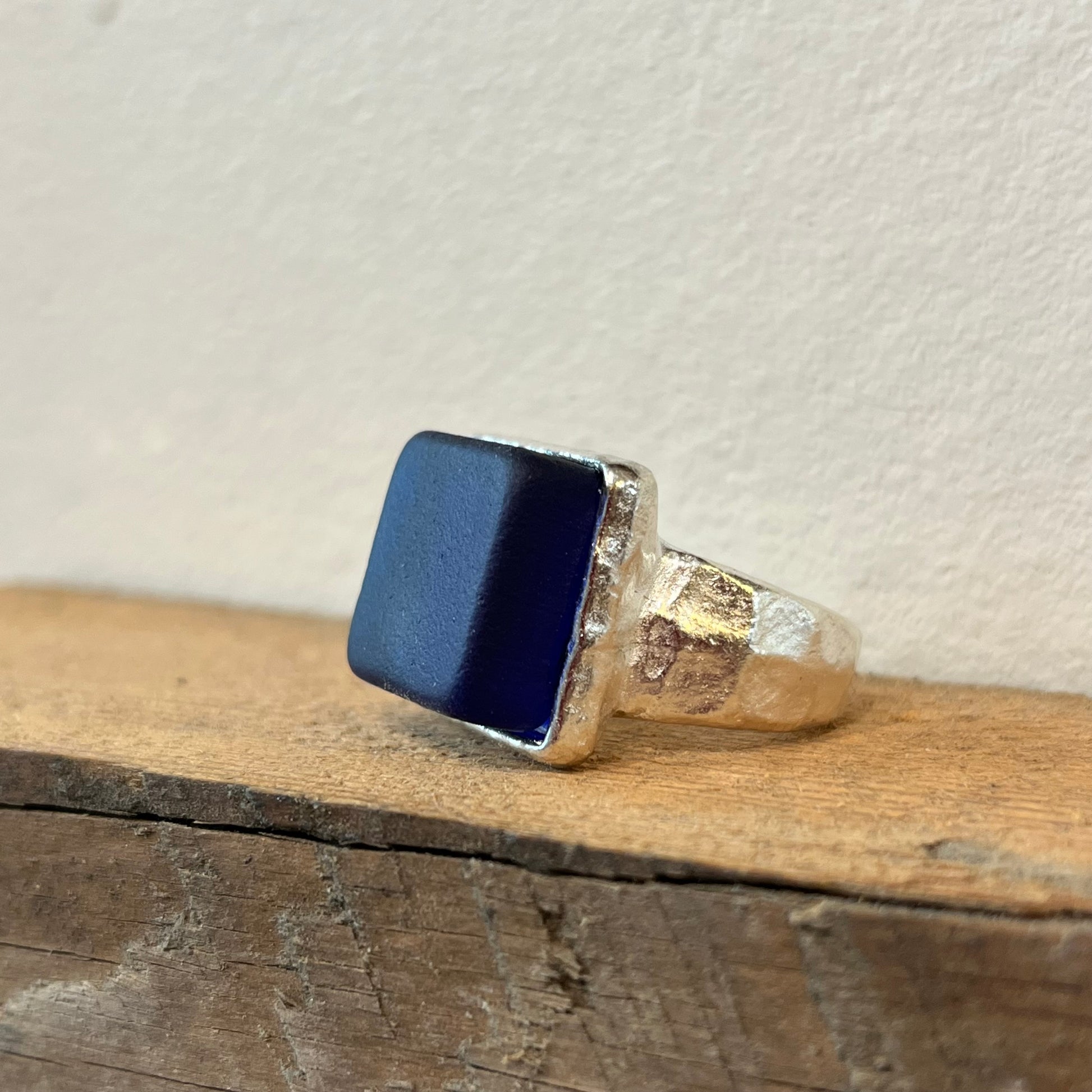 Bottles are collected from the bars, restaurants, friends, and dumpsters (really!) and transformed into the ultimate "cocktail" ring in our studio. Sterling silver or gold plated pewter. Glass approximately .75 inch by .75 inch square.