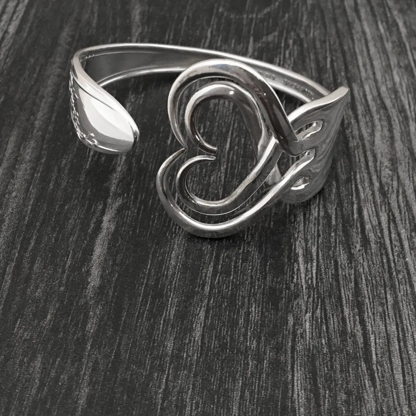 The Heart 4 fork bracelet is our most popular heart design. Handcrafted from a vintage silver-plated dinner fork, this design features a heart surrounded by a second heart. It comes in an adjustable style or size with a spring hinge.