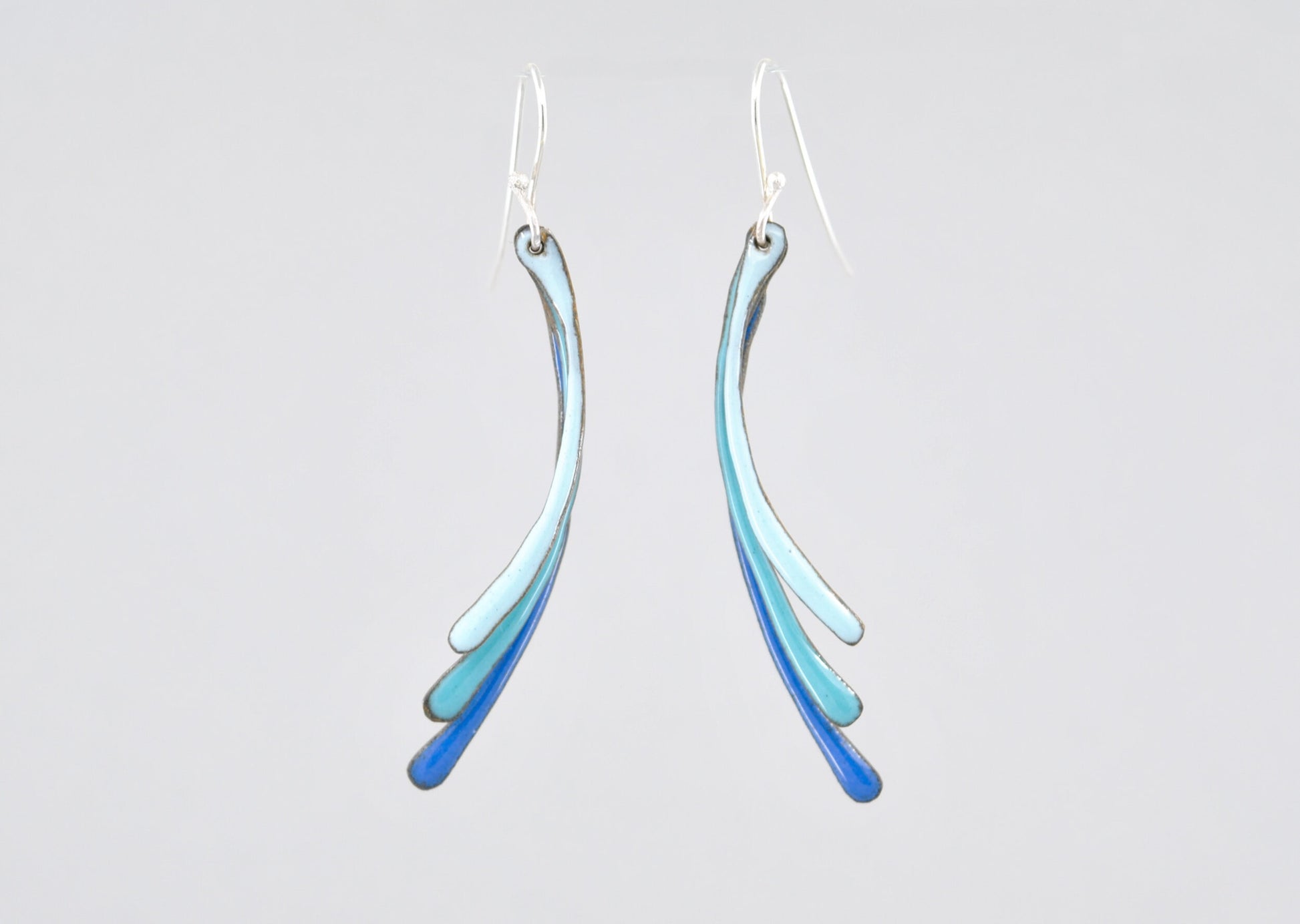 These earrings, inspired by the textures and colors of the ocean shoreline, are made from sterling silver and enameled steel. Three lightweight enameled forged steel pieces balance delicately on hand-formed recycled sterling silver earwires.