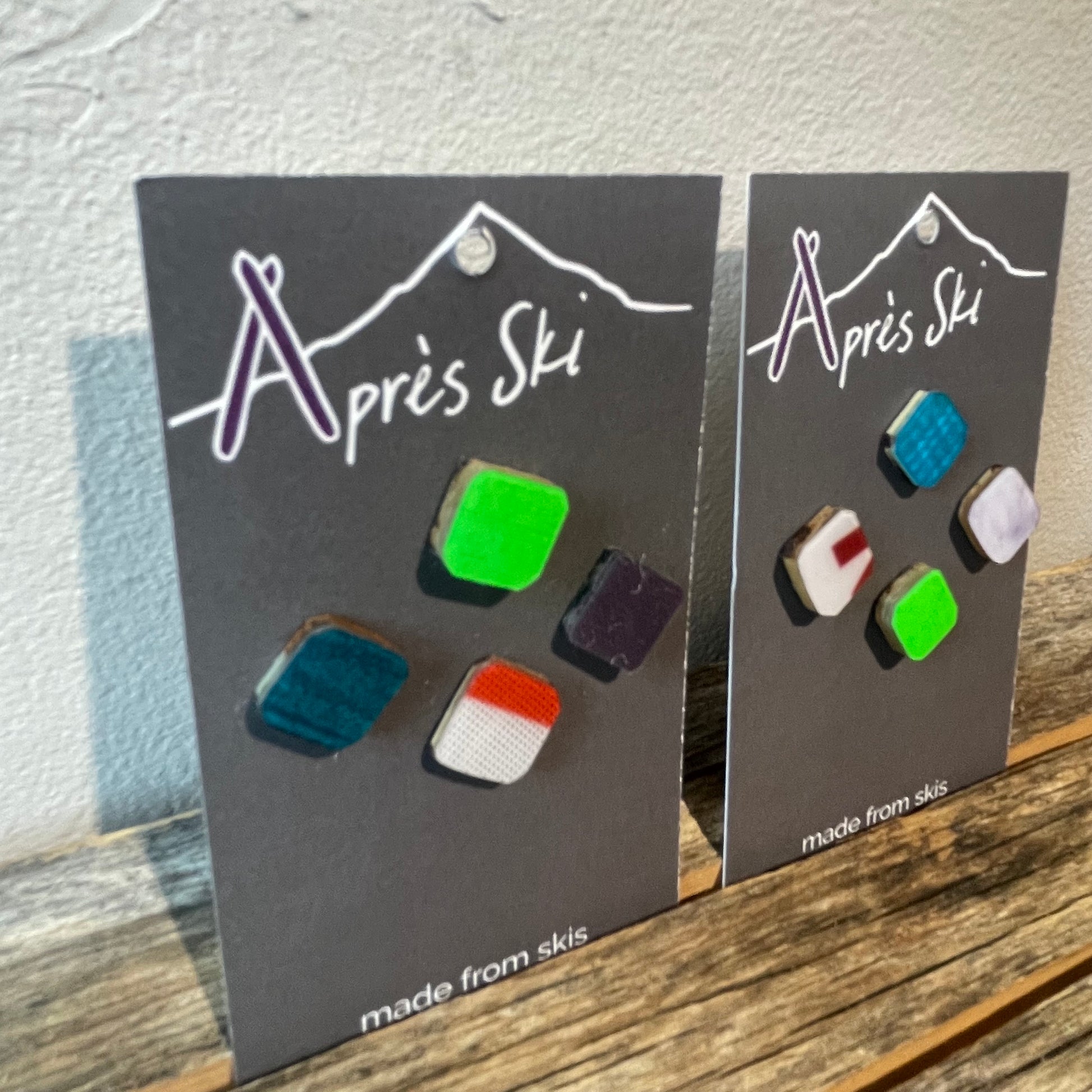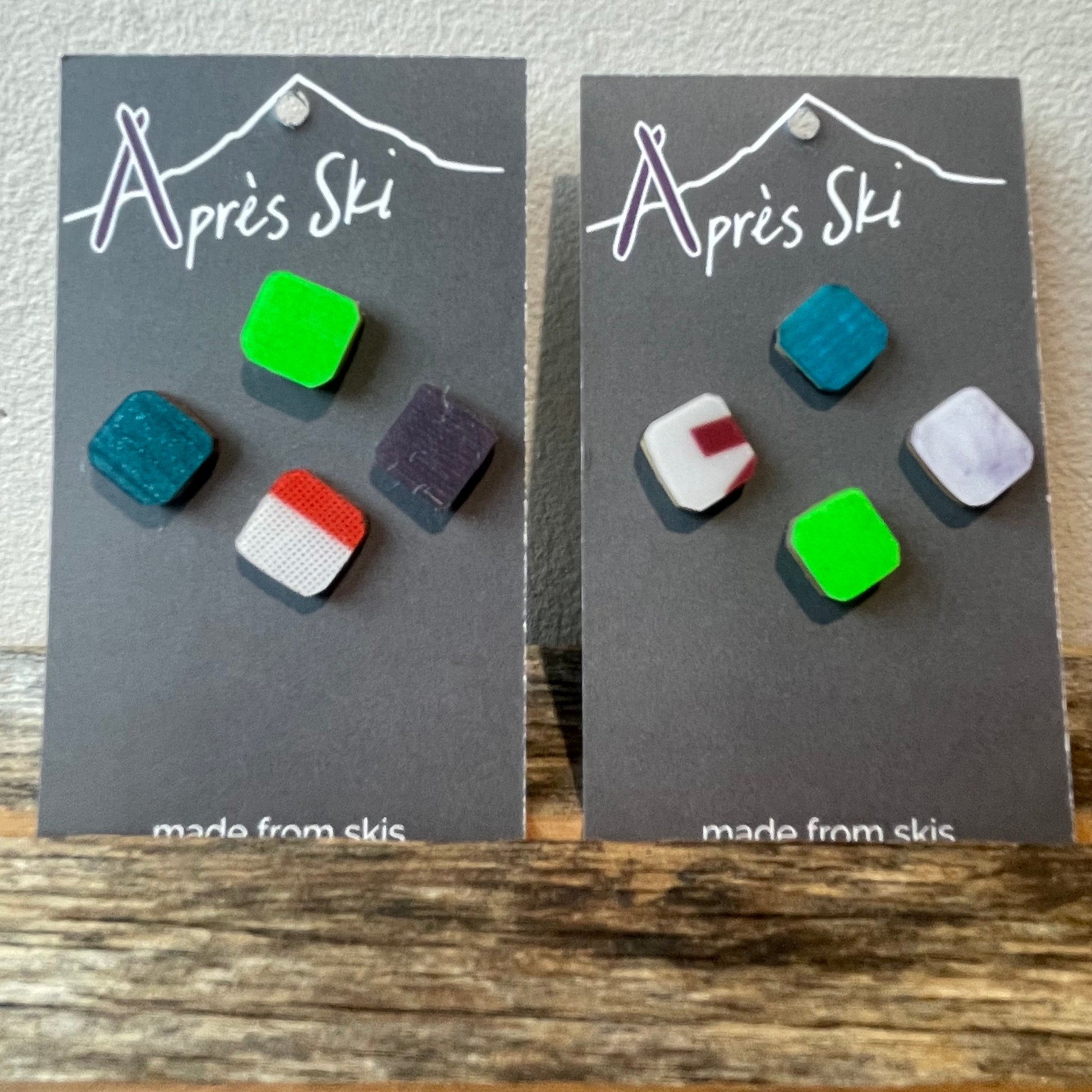 Sleek, unique, colorful studs made from reclaimed skis. 3/8" x 3/8" square with stainless steel findings. Each card is a