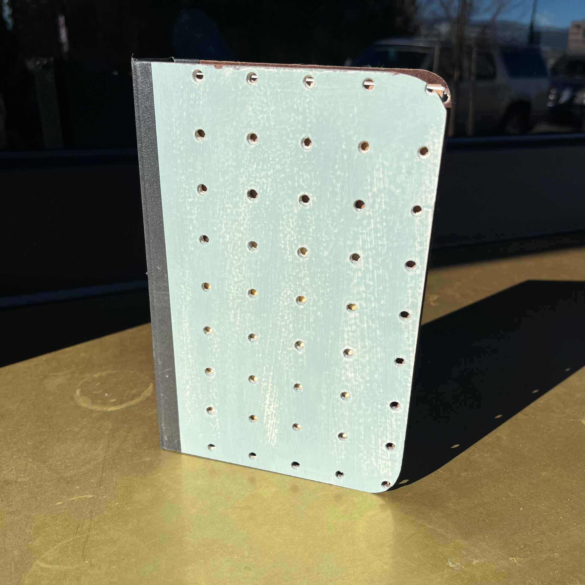 Crafted from a repurposed painted peg board. Inside you will find a handy pocket to corral loose papers and cards. The interior pocket and design will vary slightly from piece to piece.