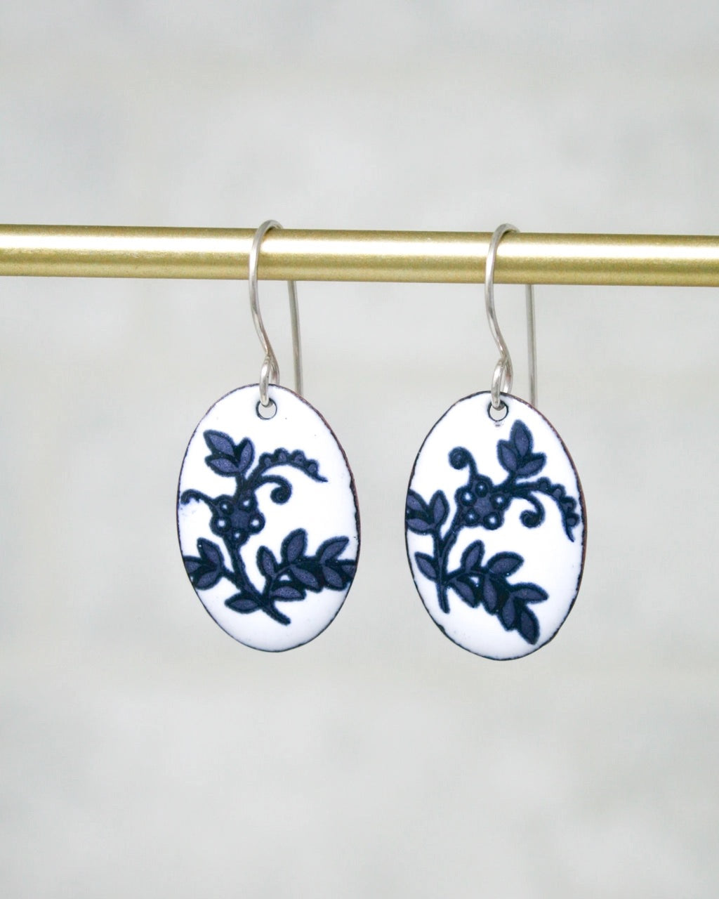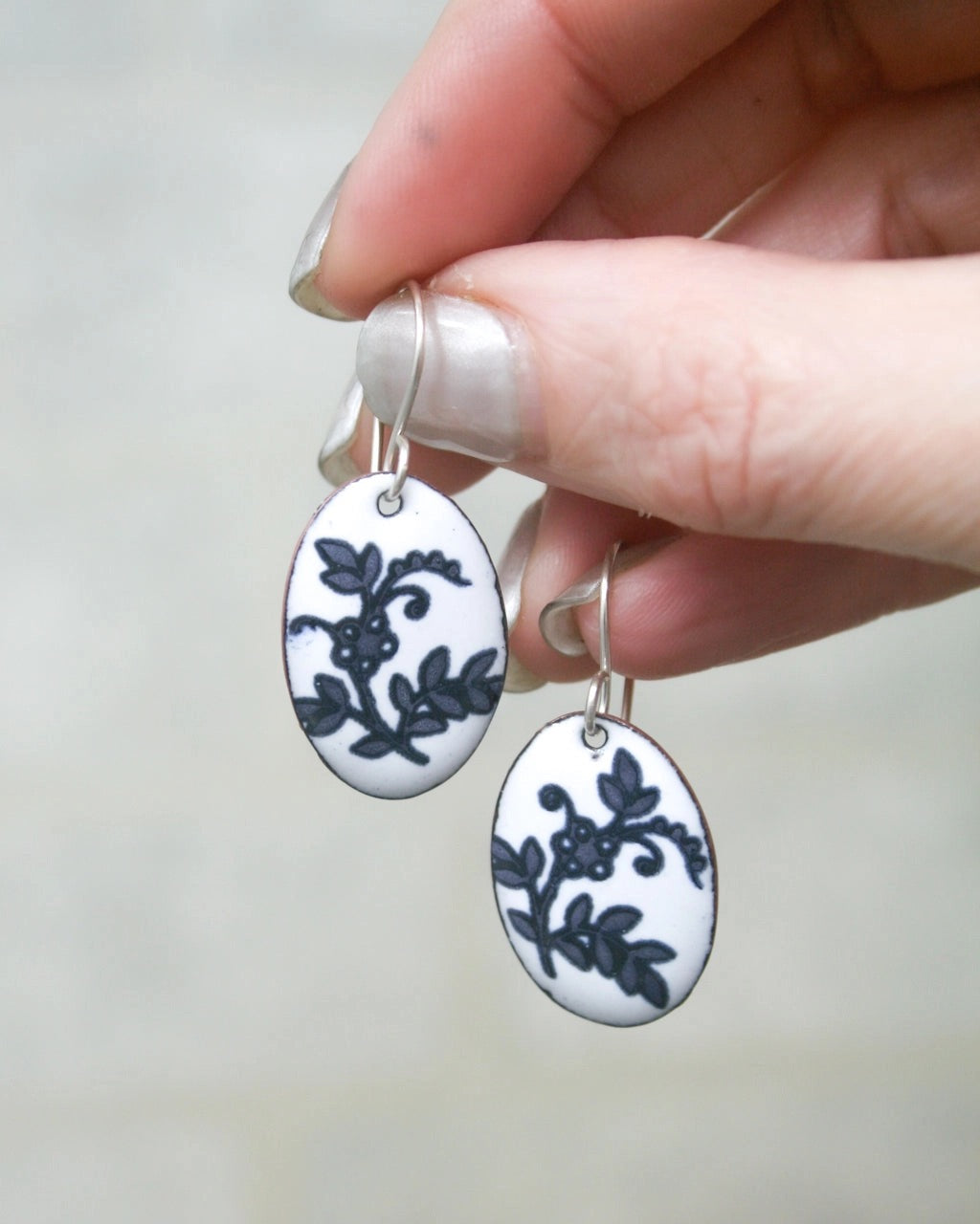 Our earrings feature upcycled vintage decals, fused onto enamel to create beautiful and unique pieces. Each pair is made in limited quantities, making them a distinctive addition to any collection. With their timeless appeal and lightweight, comfortable design, these earrings are perfect for customers who appreciate unique, sustainable jewelry.