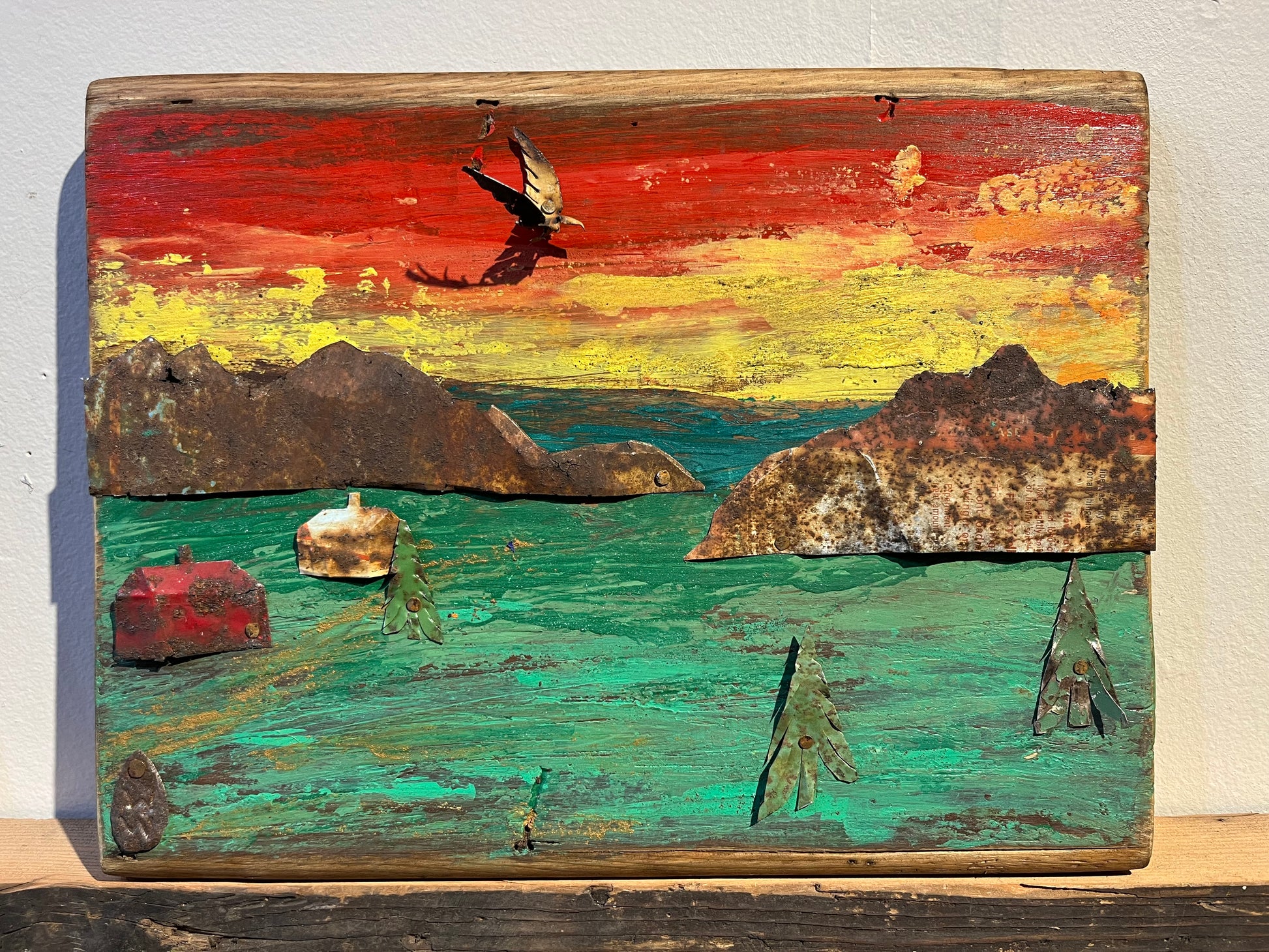 Frank Humphreys Tinscape boldly transforms reclaimed tin and old wood plank into a striking landscape piece. Each element carries the rugged history of fields and old homesteads, fused to create an artful statement that defies the ordinary. This daring creation brings raw texture and resilience to your space, celebrating the beauty of weathered materials with undeniable character. 9" x 12"