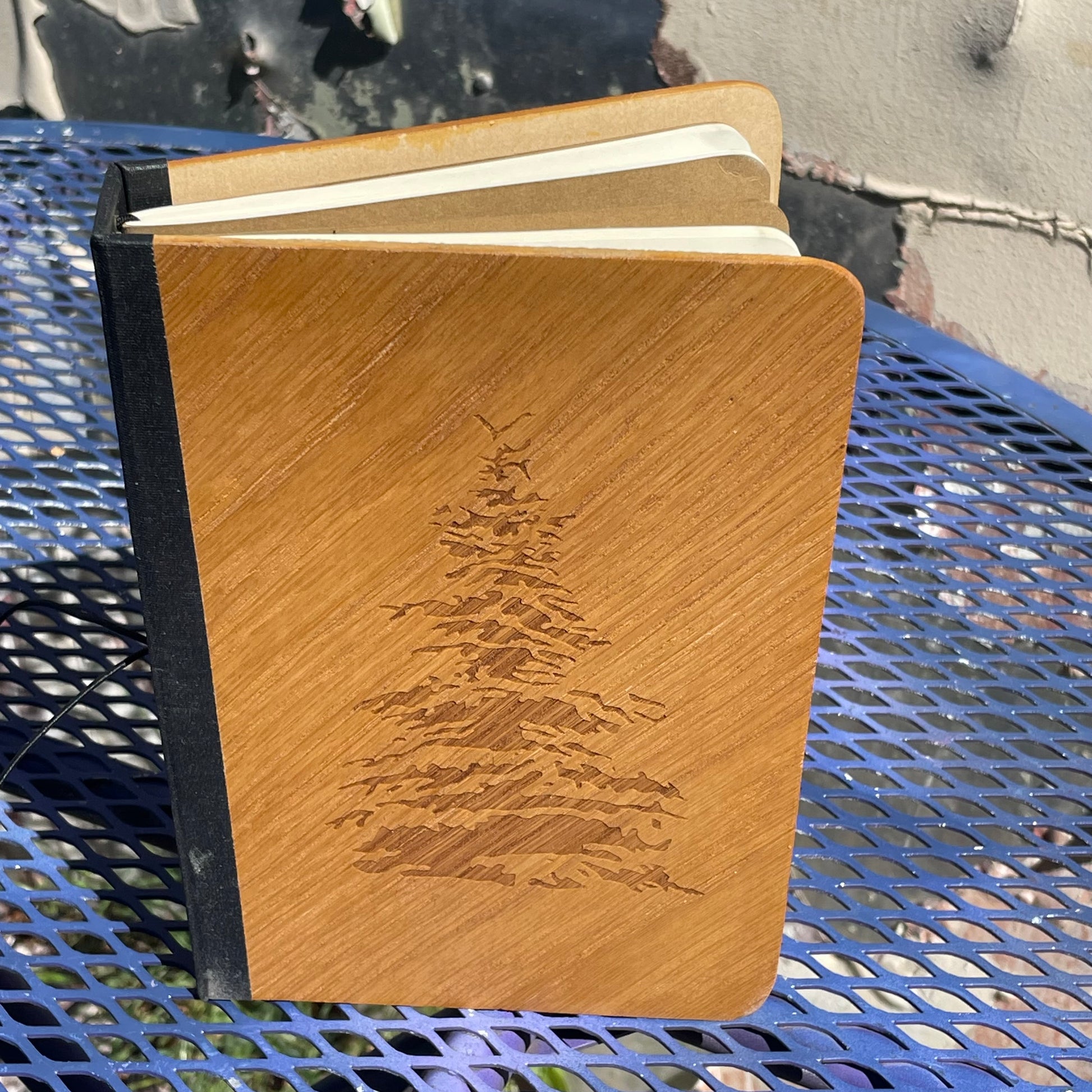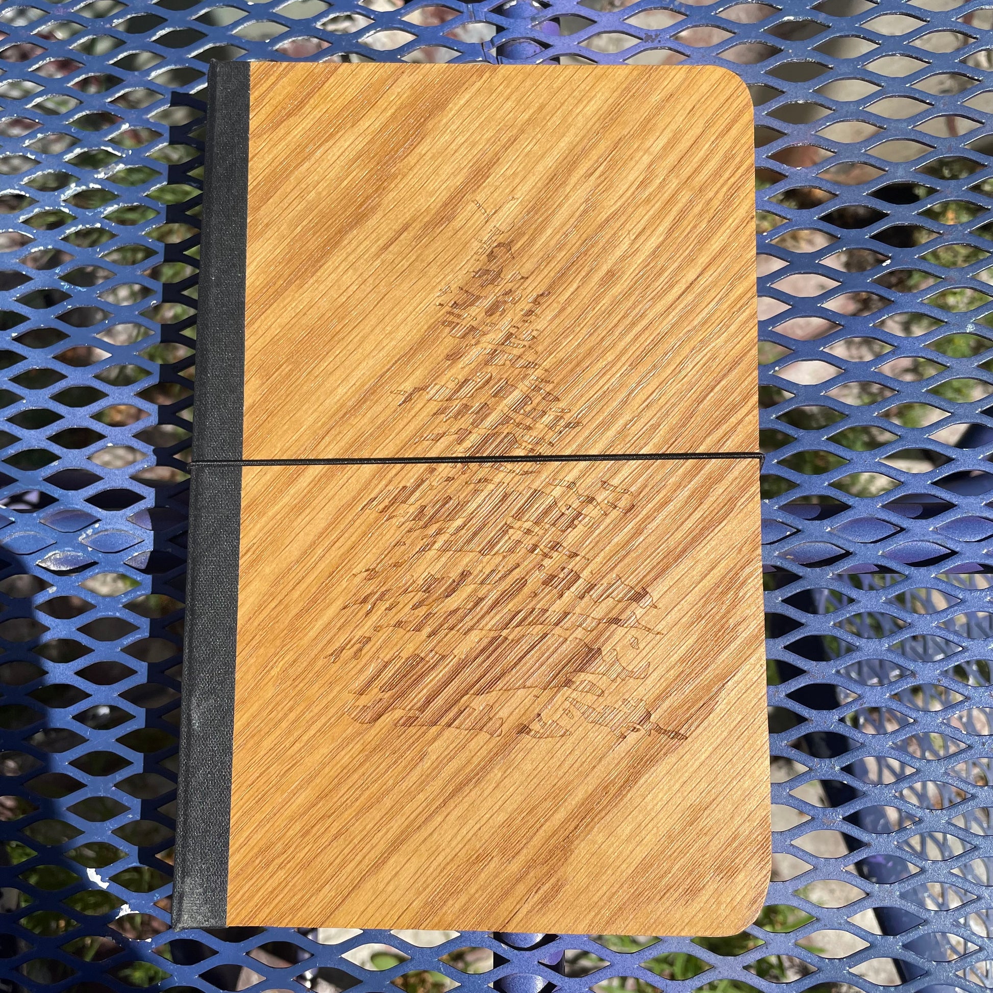 The cover shows the striking wood grain. Cover image is engraved into the panel. Inside the front cover, you will find a handy pocket to corral loose papers and cards. Interior pocket may vary in print design from piece to piece.