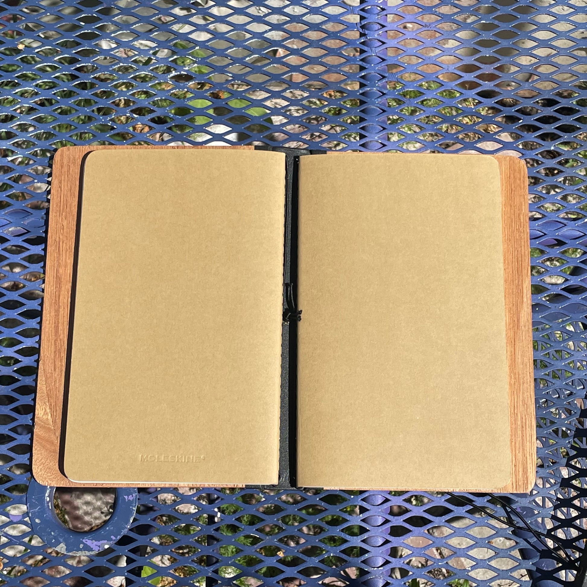 The cover shows the striking wood grain. Cover image is engraved into the panel. Inside the front cover, you will find a handy pocket to corral loose papers and cards. Interior pocket may vary in print design from piece to piece.