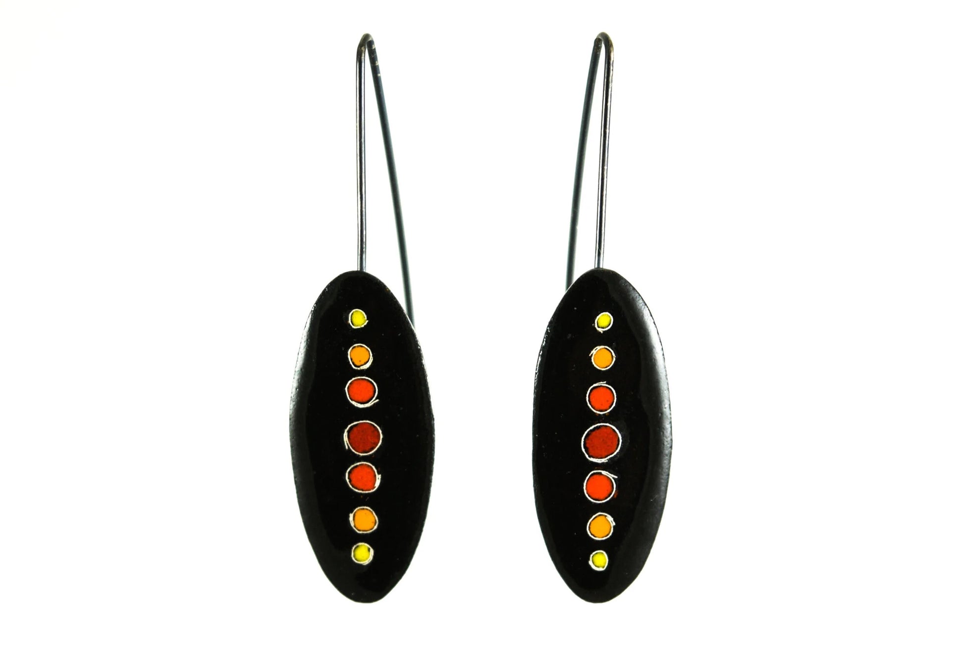 Made using the cloisonné enameling technique, these earrings are handmade with enameled reclaimed steel, recycled sterling silver, and brass. Cloisonné is a process of filling small sections of thin silver wire with different colors of enamel so that the colors do not blend during firing. After many layers and firings, the enameled surface is sanded level and refired.